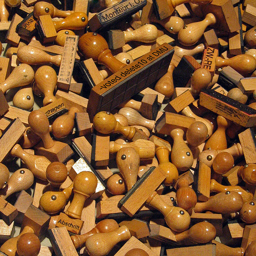 A customized stamp with her name and address, so she can create her own stationary on cardstock. Very chic! Call this stamp guy in New York: 917-669-4151. (Stamp photo by Slowburn.)