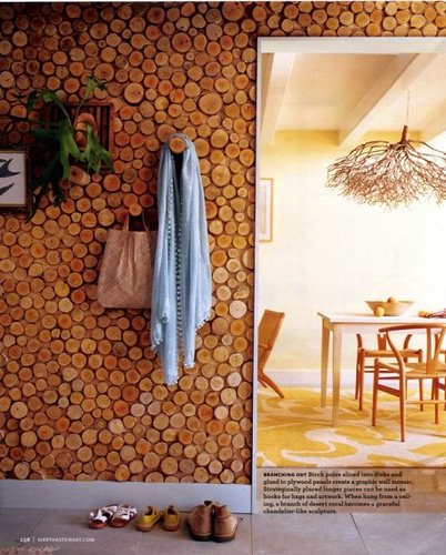 Birch poles sliced into disks and glued to plywood panels create a graphic wall mosaic.