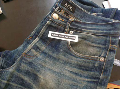 Weird news: This fall, APC will launch a line of pre-worn Butler jeans. Not just faded or ripped, but jeans that are actually worn by someone before you buy them. The jeans even feature the initials of the person on the inside. Who are these odd wearers and what are they doing in the jeans? The gimmick is amusing but seems a little over the top. What do you think?