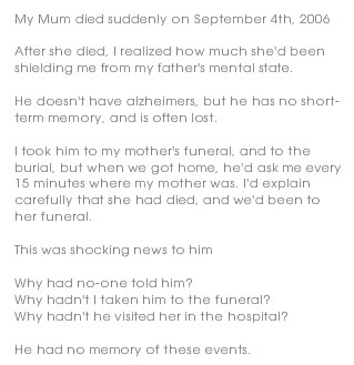 Wow Jo,My name is Margie I am going through the same thing my Mom past in May i take care of my Dad he has no short term memory I am so scared to lose him I lost my son 5 years ago at the age of 21 then my Mom he is all I have my heart is broken when he goes My heart will be gone i will have a break down I want to know how you deal and go on with life i have put my life on hold and devote all my life with my Dad you are a strong Man and God bless you.