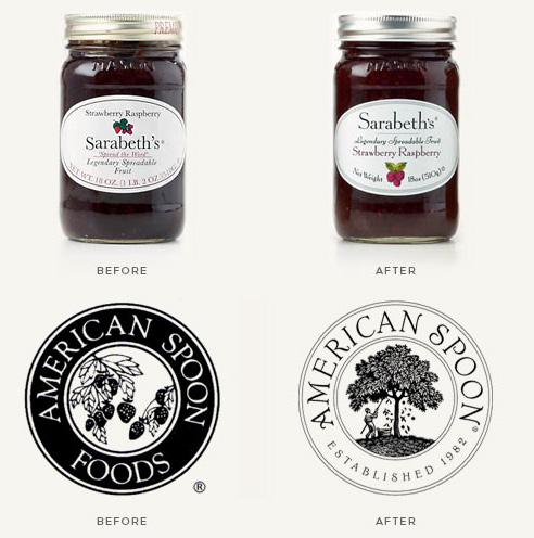 It’s like the ones on the left are old favorites that could have cult followings. I can imagine the relief of finally finding a sack of the old Dufour flour so I could finish up the finest birthday cake ever made. The new American Spoon logo makes me feel like I must be in Manhattan and hoping nobody is seeing me paying too much for whatever this is. I mean, look at that font! Was it around in 1982? I’ll hazard not. The old logo makes me feel like I’m in north west connecticut buying the same thing they’ve been making for ages and ages.