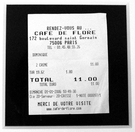 My friends Susan Cernek and Rob Giampietro framed this receipt from their first trip to Paris together in 2006. They’d had two coffees at the Cafe de Flore, and now the receipt hangs in their kitchen, as a lovely reminder. How cute is that?