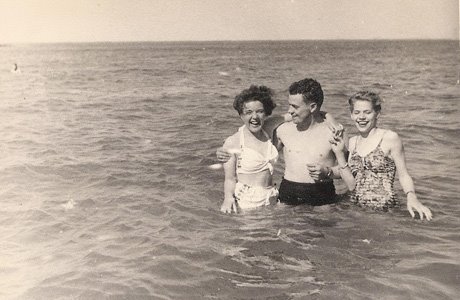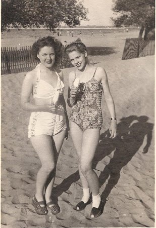 My mom just sent me these photos of my grandmother at the beach. She was English but moved to Chicago (so brave) to marry my grandfather, who she had met during the war. I love her retro swimsuit and lovely round face–and how my grandfather is gazing at her!