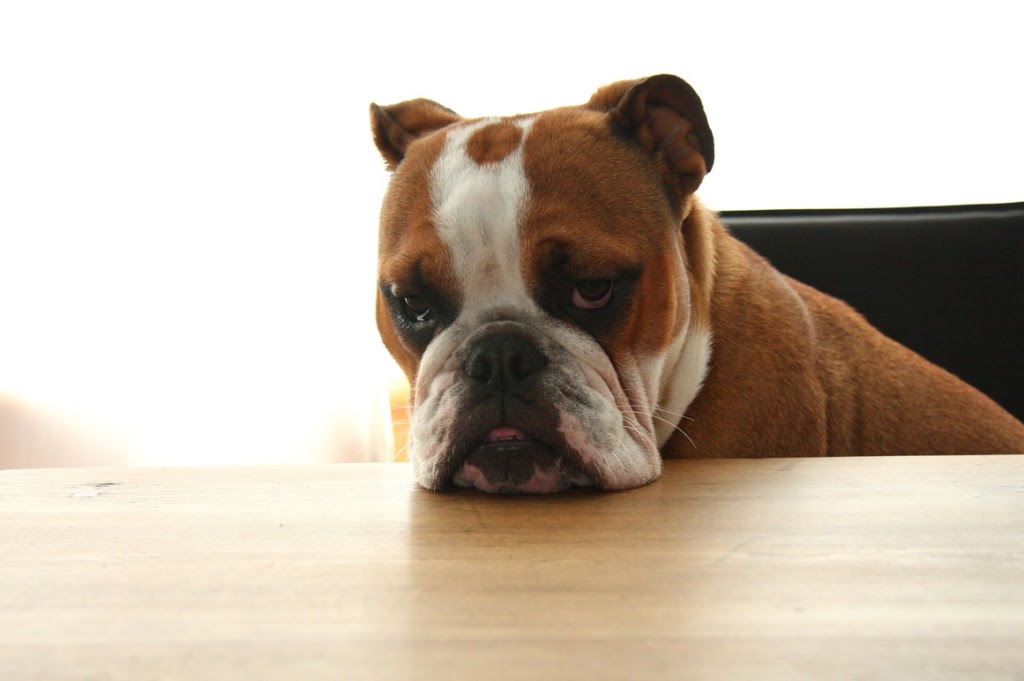 aw! the dog looks so absolutely adorable and obviously sad, why the sad face little bull dogie?