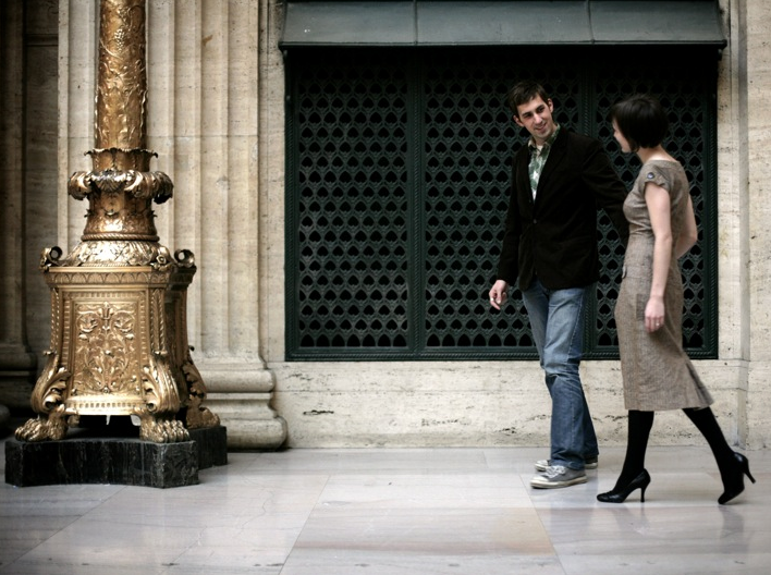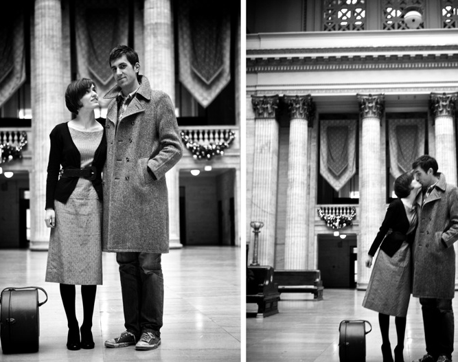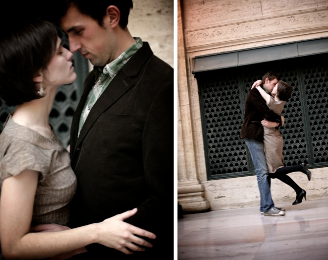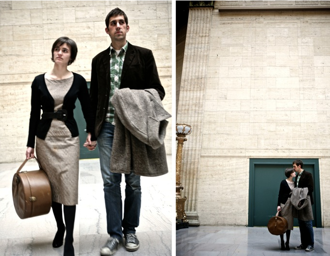 These engagement photos remind me of a French psychological thriller. (The first one looks especially ominous!) “Meghan wore her grandmother’s dress and Robb a vintage wool coat,” says the photographer Emily Johnston Anderson. “The hat box is mine, which I suggested to complete the vintage look.”