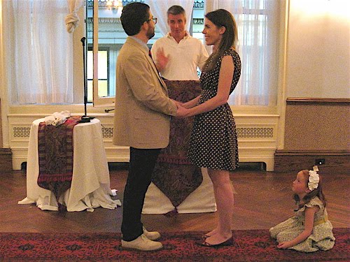 My mom just sent over this hilarious photo of our rehearsal. Alex and I were practicing our vows, and we thought we were alone in the room with my uncle, who performed our ceremony. Little did we know that our flower girl, Grace, was lying behind me the whole time! How adorable is that?! She had red hair, spoke with a British accent and was like a little puppy following us around everywhere.