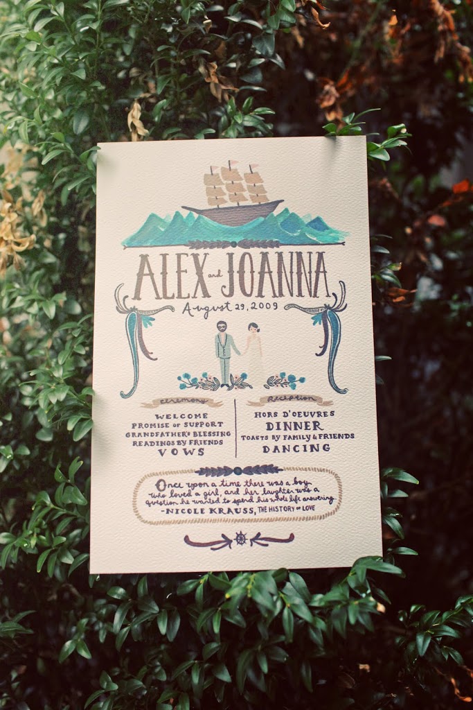 We were lucky enough to nab the super talented Anna Bond of Rifle Design for our programs. She was wonderful to work with, and we adored her hand-painted illustration of a ship on the waves. She even drew my dress exactly like it was, as well as Alex’s beard and glasses! At the bottom, we included a romantic quote from one of our favorite novels, The History of Love. A program was put on each guest’s chair (and, later, on our fridge).