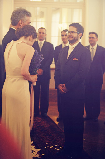 At this moment, my uncle, who officiated our ceremony, had just asked, “Who gives this woman to marry this man?” And my dad answered, “She comes of her own accord, with the full support of her mother and me.” I loved how feminist and independent that sounded, while still honoring tradition and family. (It was my mom’s idea.) Although it did, as you can see, make me laugh a little in the moment. And I love Alex’s expression here!!!
