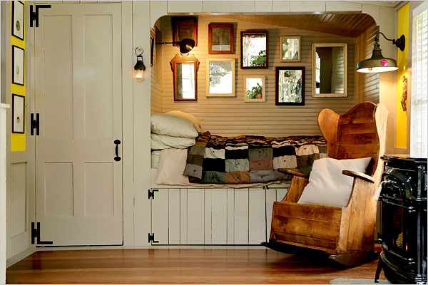 Marc and Sean’s farmhouse in Walton, New York, is beautifully cozy. You can almost smell the bonfire. And don’t you want to cuddle up in the bed nook, with its thick quilt and antique mirrors?