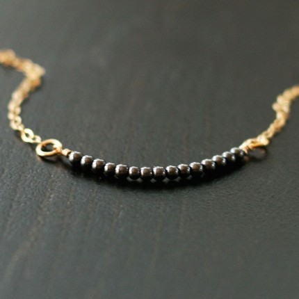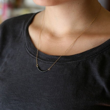 Today’s giveaway is from Elephantine, a jewelry shop based in Seattle. Rachel, the designer, is offering this Amelia necklace, on which a curve of tiny hematite beads hangs from a delicate gold chain. This timeless necklace would look absolutely lovely year-round and seems like something a French woman would wear.