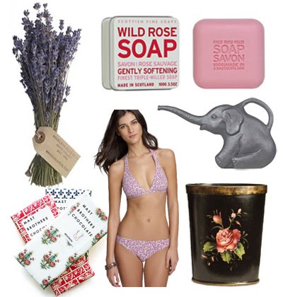 * A bundle of lavender, $10 (which lasts for ages); wild rose soap, $10; an adorable elephant watering can, $4.49; a vintage flower trash can, $34.50 (I just got one of these for our bedroom); a floral bikini from J. Crew, $110, and Mast Brothers chocolate bars, $10 each (their Salt and Pepper version sounds especially delicious). xoxo