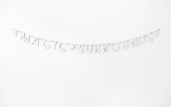 Oooh, I’m loving these fabulous banners, which are making their way around the blog world. They’d be fun to string up for a cocktail party or to display everyday at home. (“Magic Surrounds” would be especially sweet in a nursery.) The best part? They’re only 10 bones!