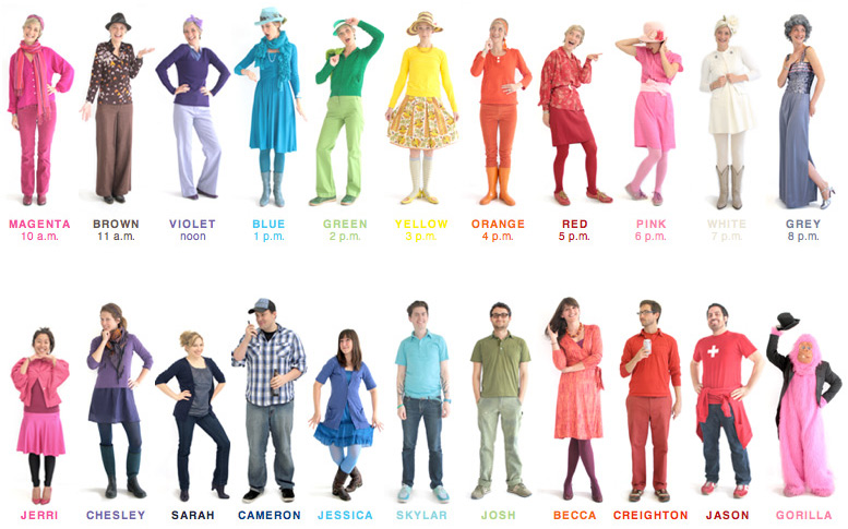 Jessi Arrington loves color, so she decided to have a rainbow birthday party. Everyone had to dress in a single color, and Jessi herself changed into a different color every hour! Awesome. (Click the photo to enlarge.)