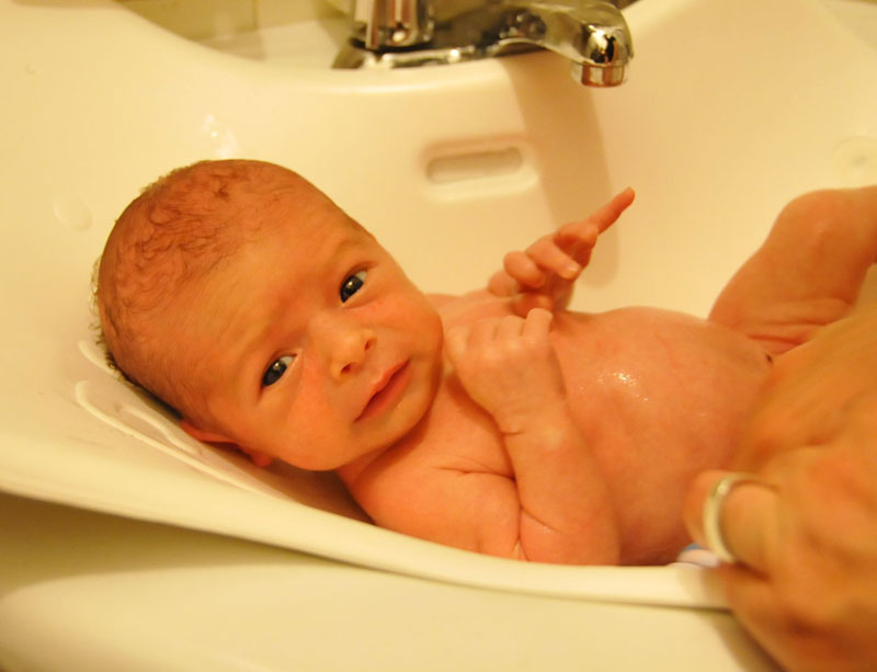 My mother tells me that if a baby doesn’t like a bath, you should wet a towel and put that on the bottom of the tub. That way they feel a surface and that makes them more comfortable. Maybe it’ll help.