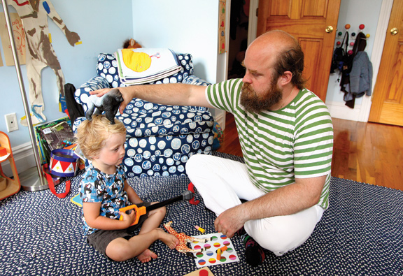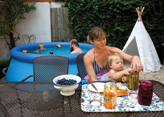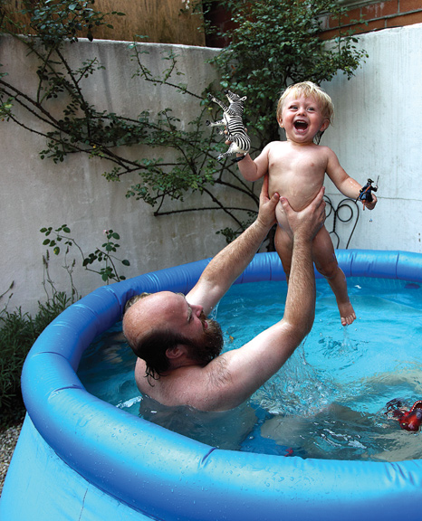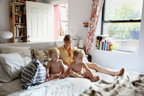 (These photos show Anna and Tim Harrington and their sons Benji and Casper. As lead singer of the punk band Les Savy Fav, Tim is known for his crazy theatrics–he must be such a fun dad. Anna and Tim also run the textile company Deadly Squire. Their photos make me want to pickle vegetables and buy a pool.)