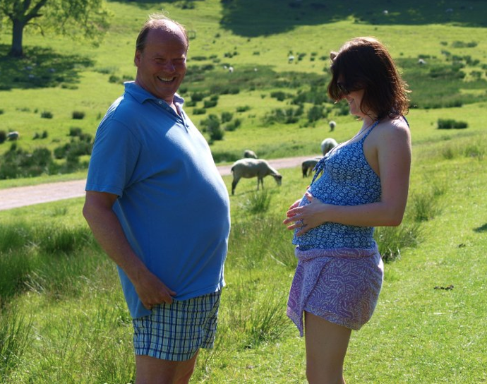 My British cousin Livvy was pregnant the same time that I was and she would send over the cutest photos. This funny shot of Livs and her dad was taken in Dorset when she was six months pregnant. :)