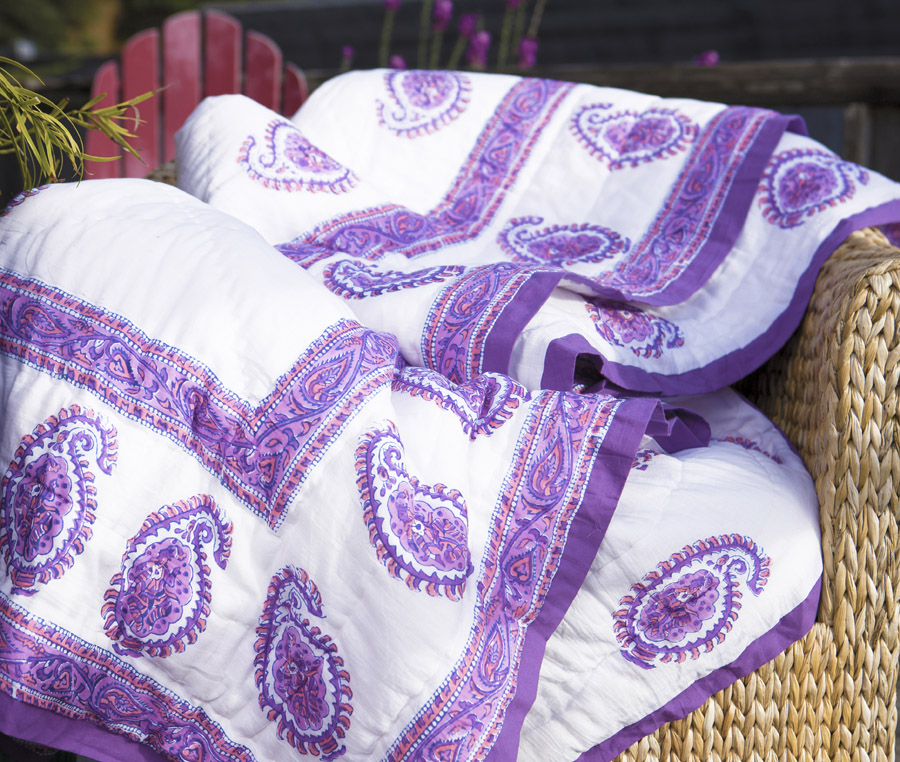 Today’s giveaway is from Attiser, a collection of beautiful linens made with handmade block-printed Indian textiles. (My sister’s husband‘s family is from India, and ever since their wedding–with all the stunning saris–I’ve been enamored with Indian prints.) The shop is offering their amethyst amore quilt, which would work beautifully as a cozy bedspread or picnic blanket.