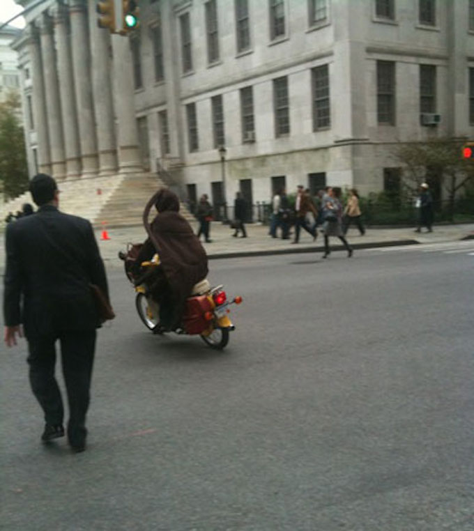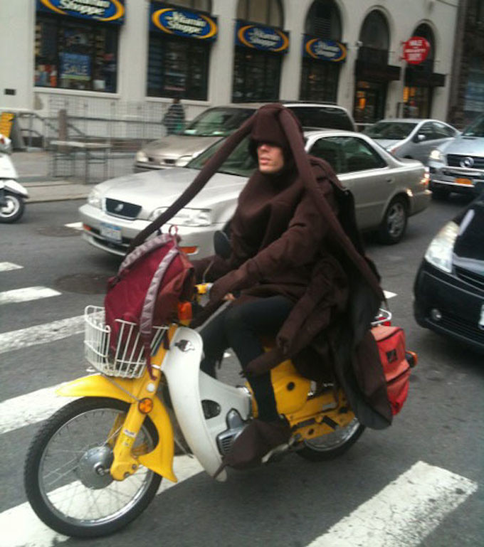 In yesterday’s gift guide, I described my brother Nick as riding a yellow motorcycle and dressing as a bedbug for Halloween. So I thought I’d share these photos from last Halloween, when he rode to work in full costume!! The feet kill me.