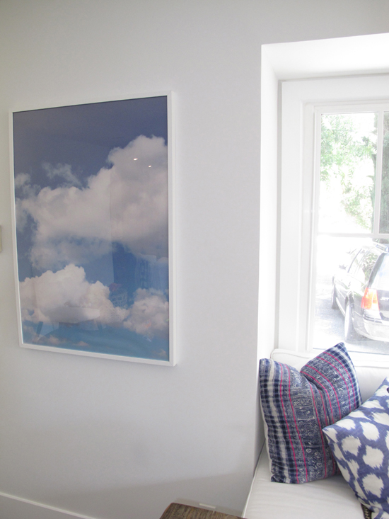 Since Alex and I are giving our bedroom a makeover, we’ve been thinking about new artwork. Well, this is genius: Amber took her a snapshot of clouds and then blew it up on glossy poster paper for $30. Then she framed it in an IKEA Ribba frame. The whole project cost less than $60, and it’s gorgeous! Double thumbs up! I’m super inspired.