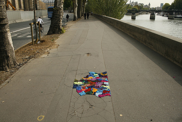 What a cool idea! I wonder how she does that – is it adhered to the ground or actually knitted/sewn to the cement?
