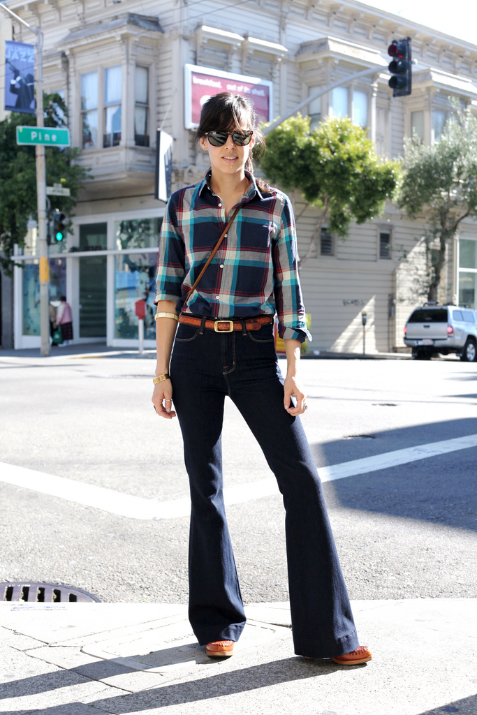 This San Francisco cutie looks adorable in her bell bottoms. I would never have thought to wear bell bottoms, but they’re so flattering and make her look like 1970’s tomboy. Now I’m itching for a dark-wash pair. Would you wear them?