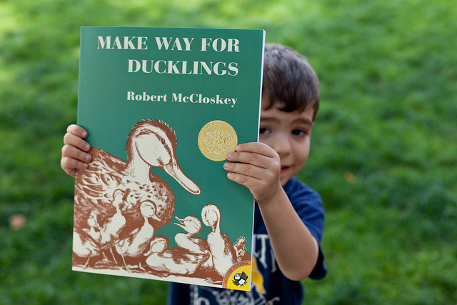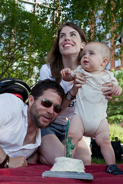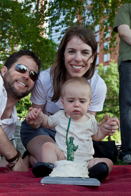 We served bagels with cream cheese, black-and-white cookies and (spiked) orange juice for the grown-ups. We made a banana cake, topped with a Statue of Liberty candle. Toby was transfixed by the flame and refused to smile for family photos:)