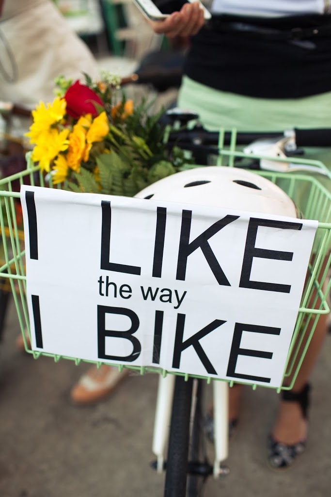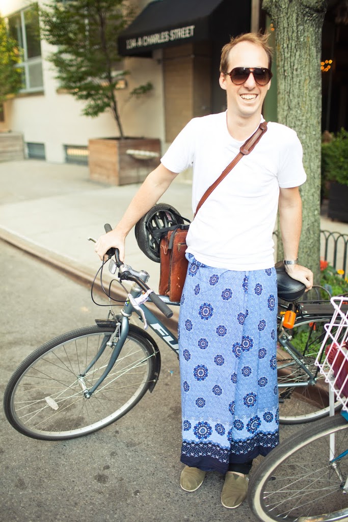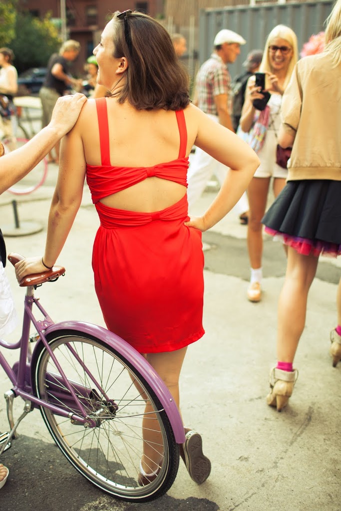 Did you hear this crazy story: In late May, a NYC cop allegedly pulled over a Dutch tourist, pictured below, and reprimanded her for riding a bike while wearing a skirt. He said she was distracting cars! At first, she thought he was kidding, but quickly realized he wasn’t when he asked for her ID. How insane is that?! So, as a lighthearted protest, a bunch of girls (and a few guys) came together for a skirt bike ride yesterday evening. My friend Shannen took a few photos…