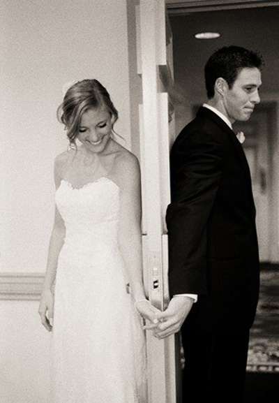 Would you rather see your groom before the ceremony or wait until you walked down the aisle? This bride and groom managed to take pre-ceremony photos without actually seeing each other: behind a door. Clever! Can you imagine how much their hearts must be racing?!