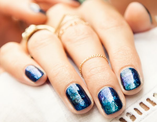 3. Now layer the glittery colors over the dark blue, but over only parts of each nail. A swipe here, a dab there. Mix things up with each nail, since you want them all to look different.