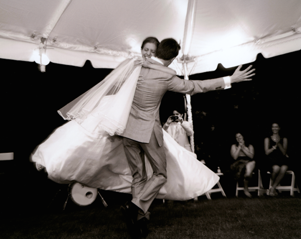 “We choreographed a dance to ‘If There’s Such a Thing as Love,’ by the Magnetic Fields. But we hadn’t practiced with Mary wearing her dress; plus, we were nervous and maybe a little intoxicated. The dance was falling apart; then her veil fell off when I dipped her. Our friends started cracking up, and we just made up our own dance. It ended up being one of our favorite moments of the wedding.” — our friends Austin and Mary