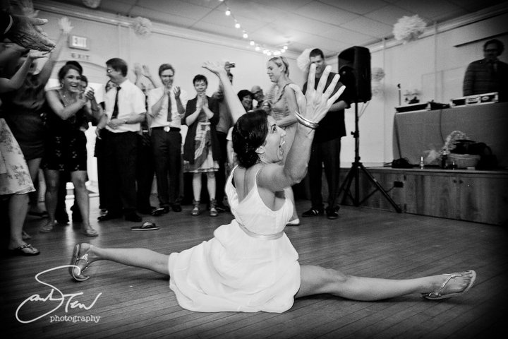 “People kept asking me if I was going to do a split; it’s my signature move. I was like, ‘Absolutely not!’ But later there was a dance-off with break dancing and an older gentleman spinning on the ground. That set off the happy endorphins. I did the split and Ninja Turtled out of it on my back.” — Kim Zatina, New York Weddings