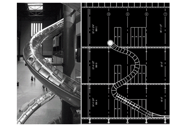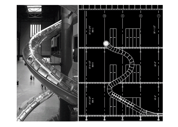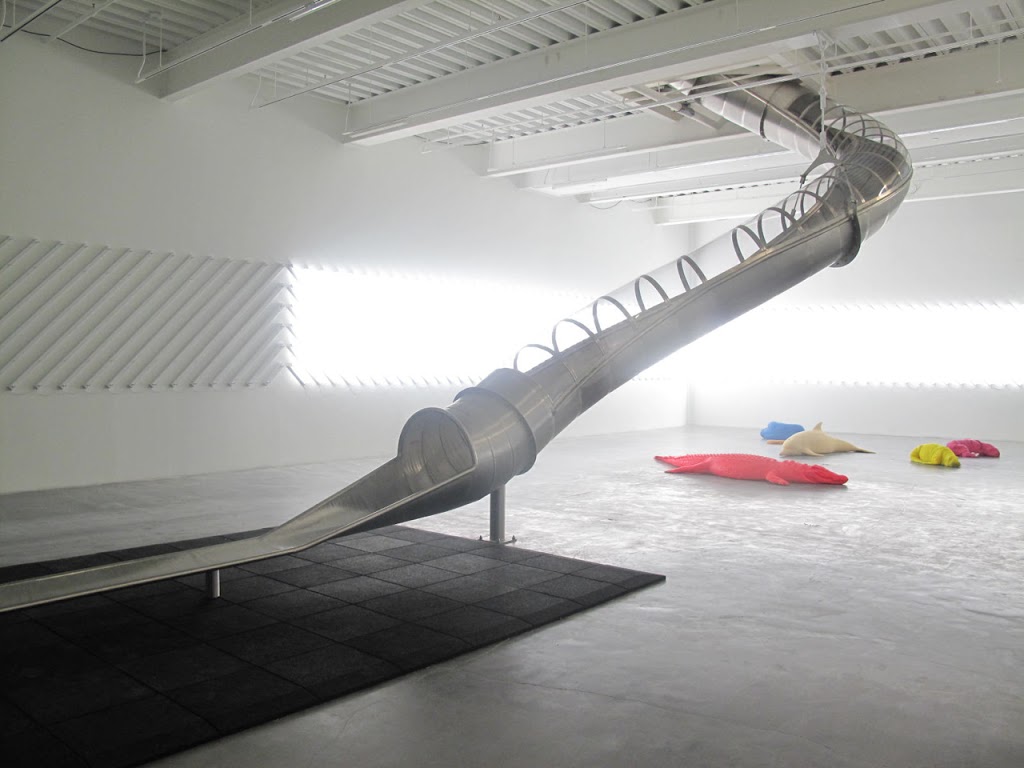 Fascinated by themes of childhood, safety, love and doubt, Höller built a 102-foot-long slide that runs from the museum’s fourth floor to the second floor.