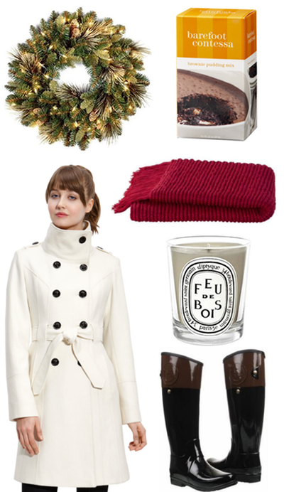 My $500 Winter Wishlist, above, is about staying cozy with a pine wreath, brownie pudding mix, a red blanket, a Parisian candle, Hunter boots and a funnel-neck trench coat for feeling pretty all winter.