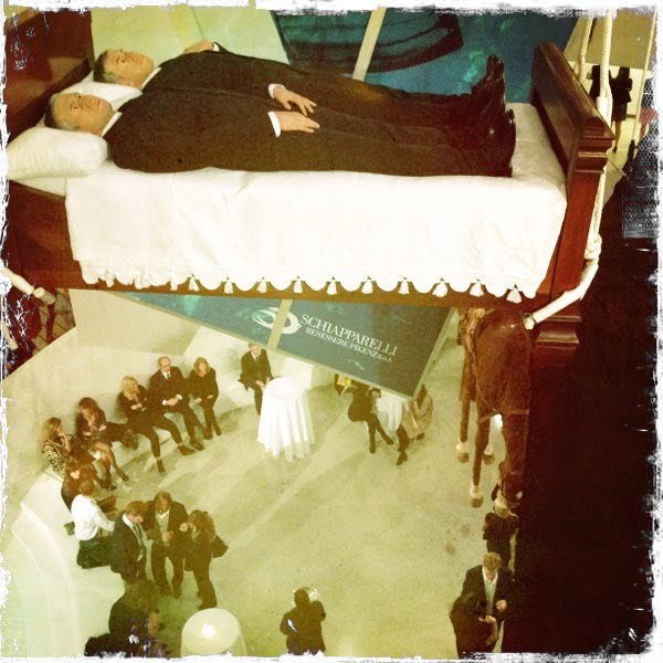 The black-and-white photo above shows Maurizio himself pretending to be a dog. “The image is comic perfection,” writes the New York Times, “a portrait of the artist as an obsequious canine, embarrassingly eager to please.” He’s a nutty artist, dubbed the “art scene’s joker”; for example, he has been known to hire people to pretend to be him during media interviews, and he instructs them to give evasive and nonsensical answers.