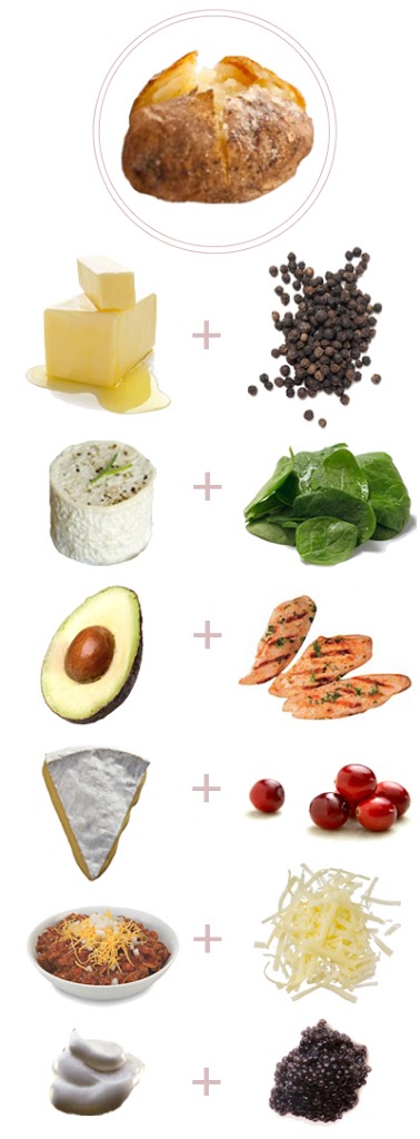We recently invited six friends over for dinner, and instead of juggling recipes (we aren’t fancy cooks), we did a baked potato bar! Alex baked the potatoes in the oven for an hour, and we put out bowls with tons of toppings. Our list of toppings: butter, black pepper, goat cheese, sautéed spinach, avocados, chicken, brie and cranberry sauce, chili, grated cheddar cheese, sautéed mushrooms, onions and garlic. (I also wanted to do sour cream with caviar–how fabulous would that be? Next time!) It was super easy and delicious. What toppings do you like on baked potatoes? Any weird ones?