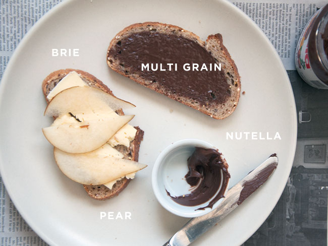 Spread a layer of Nutella on the bread. Top with thinly sliced pears and brie. Butter both sides of the bread. Grill until the outside is toasted brown and the cheese is melty.