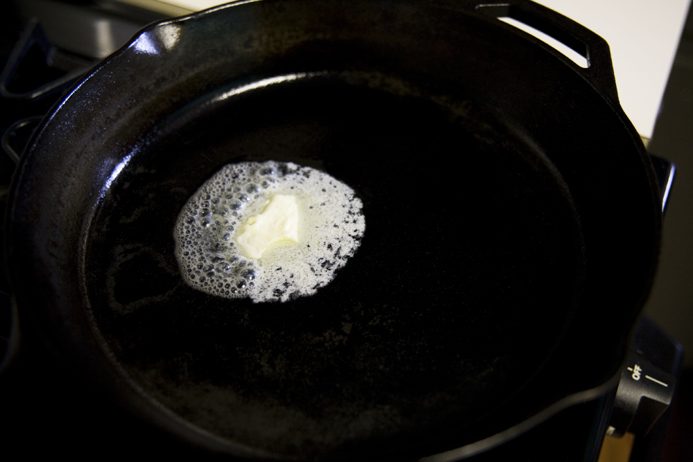 Heat cast-iron skillet on the stove. (Cast iron is the best, since it cooks evenly and doesn’t stick.) Melt butter over medium-low heat in the center of your skillet.