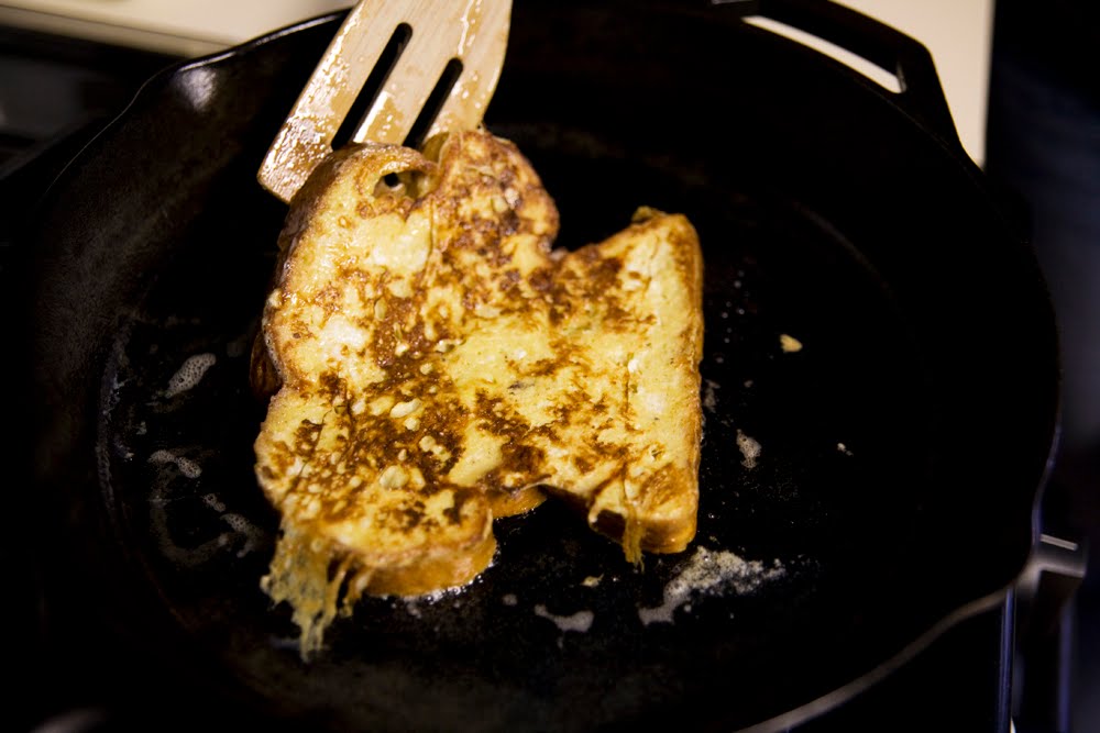 Dip bread into the egg mixture so that both sides are fully coated–but not completely soaked or your french toast will be soggy. Place one or two pieces of the bread into your skillet at a time, depending on how many will fit into your pan.