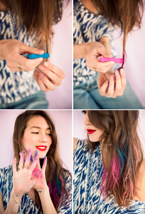 * If you have lighter hair, skip wetting the chalk first and just use the chalk dry on your hair. Wetting it may stain lighter hair a bit more than darker hair. If you find that the color isn’t showing up enough for you, you may want to run a flat iron over the part you just colored. The heat will help brighten and seal the color in.