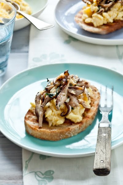 Serve the scrambled eggs over fresh or toasted bread and spoon a generous amount of sautéed mushrooms over each toast. Enjoy!