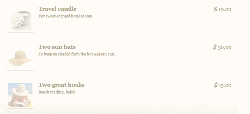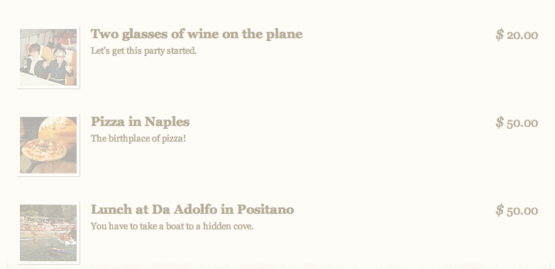 (The images above are faded because our friends and family bought the items. When they choose an item to buy, they just send the money directly through PayPal, and then you save up for your trip.)