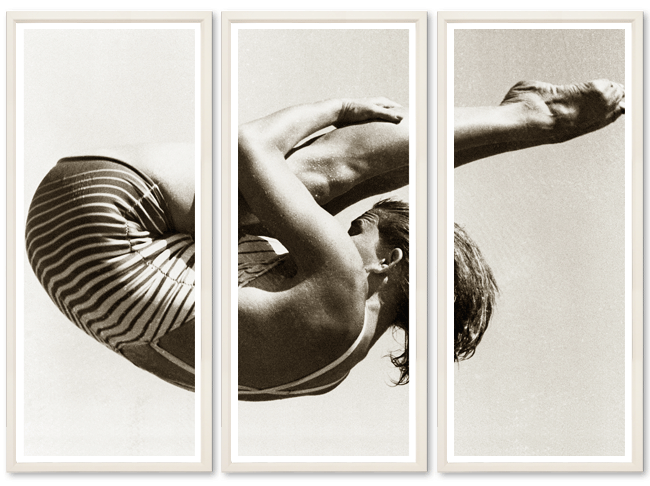 How breathtaking is this framed triptych photograph of U.S. diver Patricia McCormick doing a springboard high dive at the 1952 Helsinki Olympics? (She won the gold.) Can you imagine this hanging in a home? Beautiful.