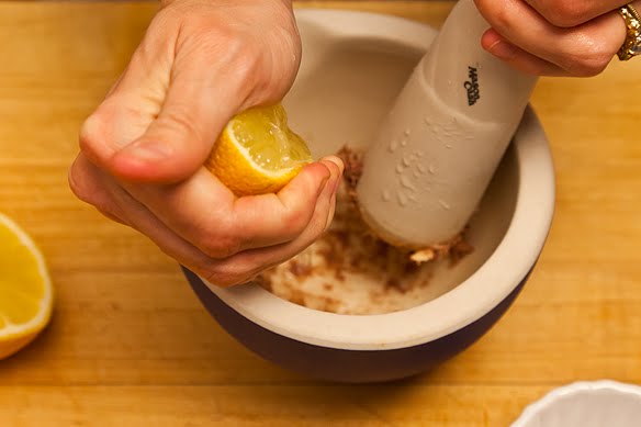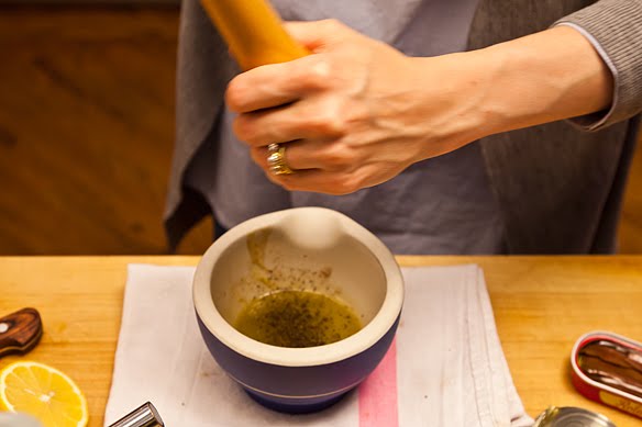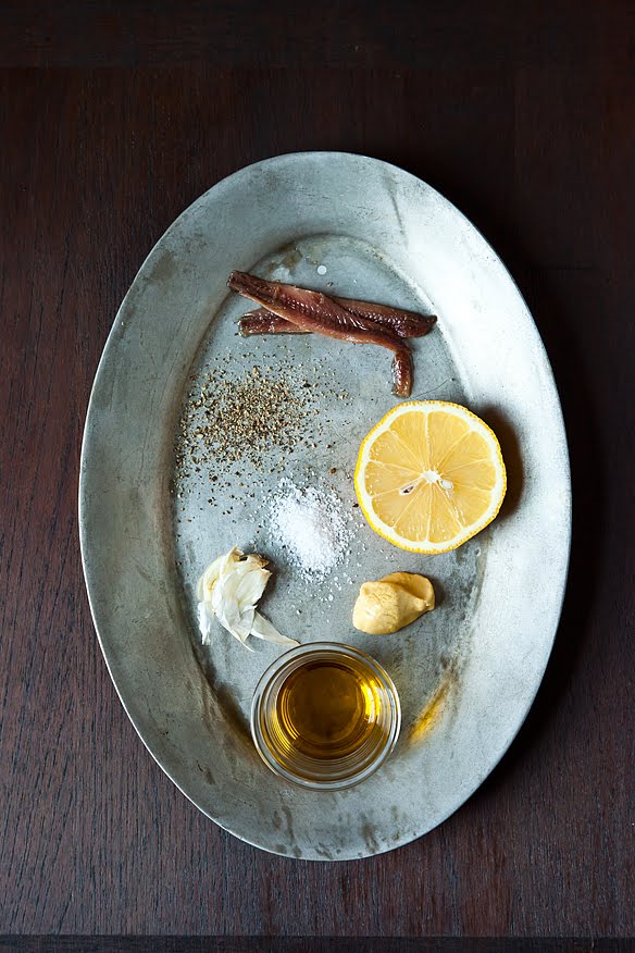 In a mortar and pestle, mash the anchovy, garlic, and a pinch of salt to a paste. Squeeze in the lemon juice and stir to break up the anchovy paste. Beat in the mustard. Either beat or whisk in the olive oil, a few glugs at a time. The vinaigrette should emulsify but will never become super tight and even, and that’s ok. Season with the pepper or chilis. Wash some sturdy or bitter greens, and you’re on your way to salad paradise.