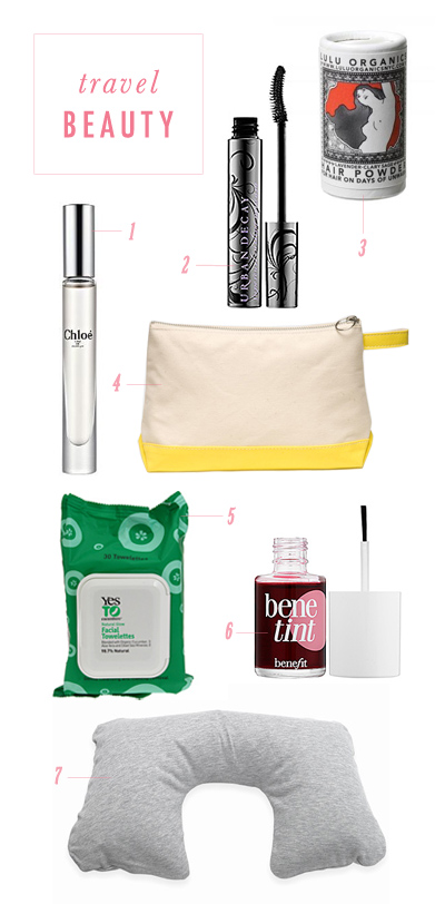 Years ago I went on a business trip with a photographer, and she spritzed rosewater on her face during the flight. It was such a lovely (and fancy!) ritual, and after that, I was inspired to come up with my own trusty beauty arsenal when traveling. (I basically pare down my everyday makeup to the essentials.) Here’s what I’ve packed every trip since…