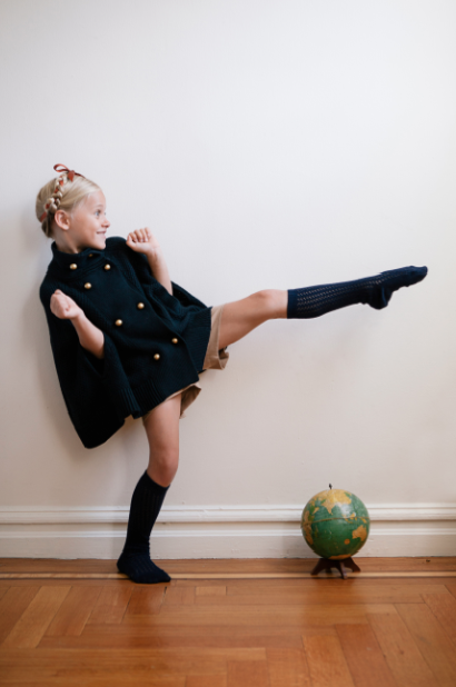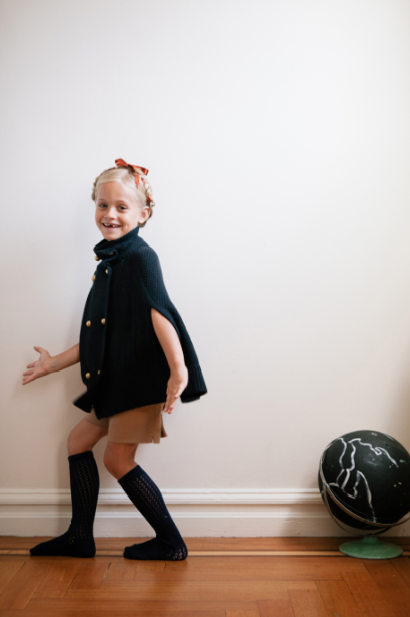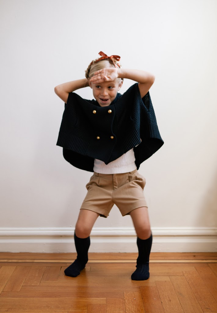 (Photos by Alpha Smoot for A Cup of Jo. Hair by Reagan Baker. Styling by Kendra Smoot. Clothing credits: Cape and socks from GAP; shorts from Zara)