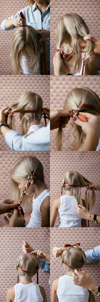 Prep: You’ll need two hair elastics (I like Goody’s clear ones) and a few bobby pins. You’ll also need a ribbon to braid into the hair; it’s best to leave the ribbon quite long so that it can be cut to your preference after the style is complete.
