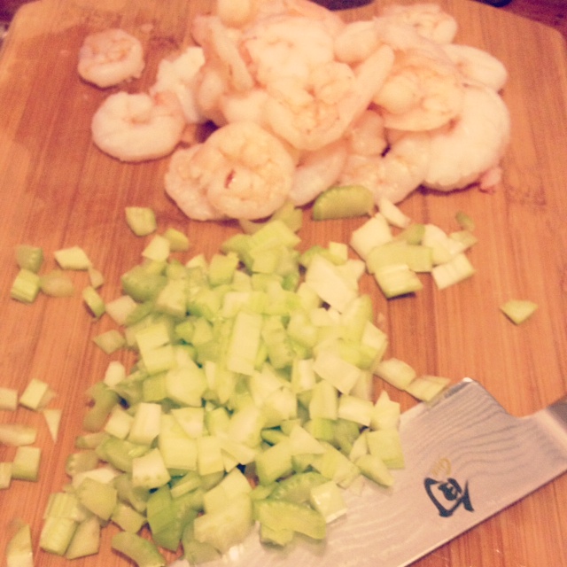 Chopping celery with shrimp.
