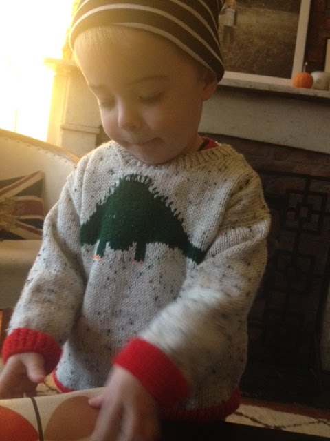 My grandmother Milly lives in England, so we aren’t able to see her nearly as often as we’d like. But she just sent Toby a dinosaur sweater that she knit herself. How sweet is that? It makes me nostalgic every time Toby wears it.