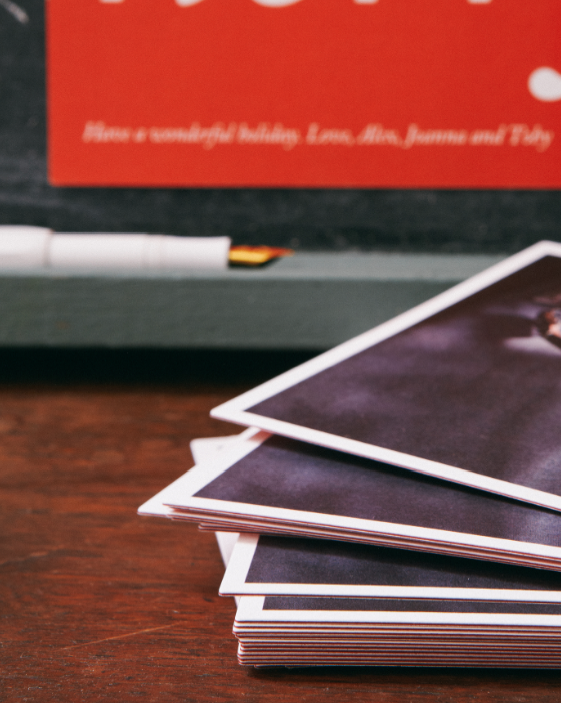 We of course turned to Pinhole Press for their lovely, simple designs. We ended up choosing one of the new Ultrathick Pinstripe Cards, which have a cool pinstripe on the sides of each card. And I like how the back simply says “Merry!” They have tons of other great cards, too.