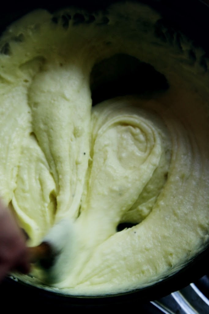 Take off the heat, and add the butter one square at a time, stirring in a circular motion. Gradually add the warm milk to smooth the potatoes, continuing to stir.